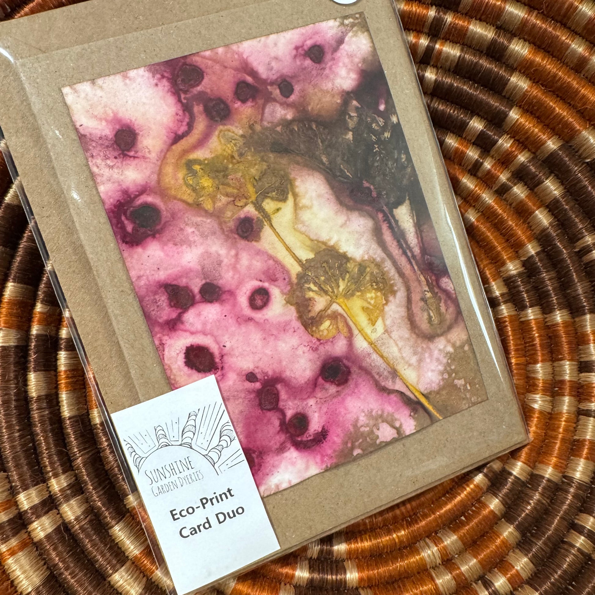 A gorgeous set of two unique eco printed cards. Local and home grown botanics, as well as commercially sourced cochineal, have been steam printed on to mordanted watercolour paper creating one of a kind prints.